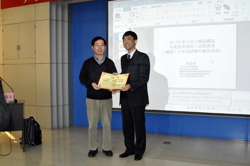 聘任仪式结束后,周建东教授为在座师生做了《2011年东日本大地震概况及新抗震加固工法的效果》的专题报告。报告会上,周教授图文并茂列举了2011年日本大地震情况,重点介绍了常用加固方法的内涵以及施工要点,中日著名建筑物的加固措施以及中日两国抗震规范的不同之处。整个报告会周教授妙语连珠,内涵丰富,数据详细,论证严谨,赢得了与会师生的一致好评。