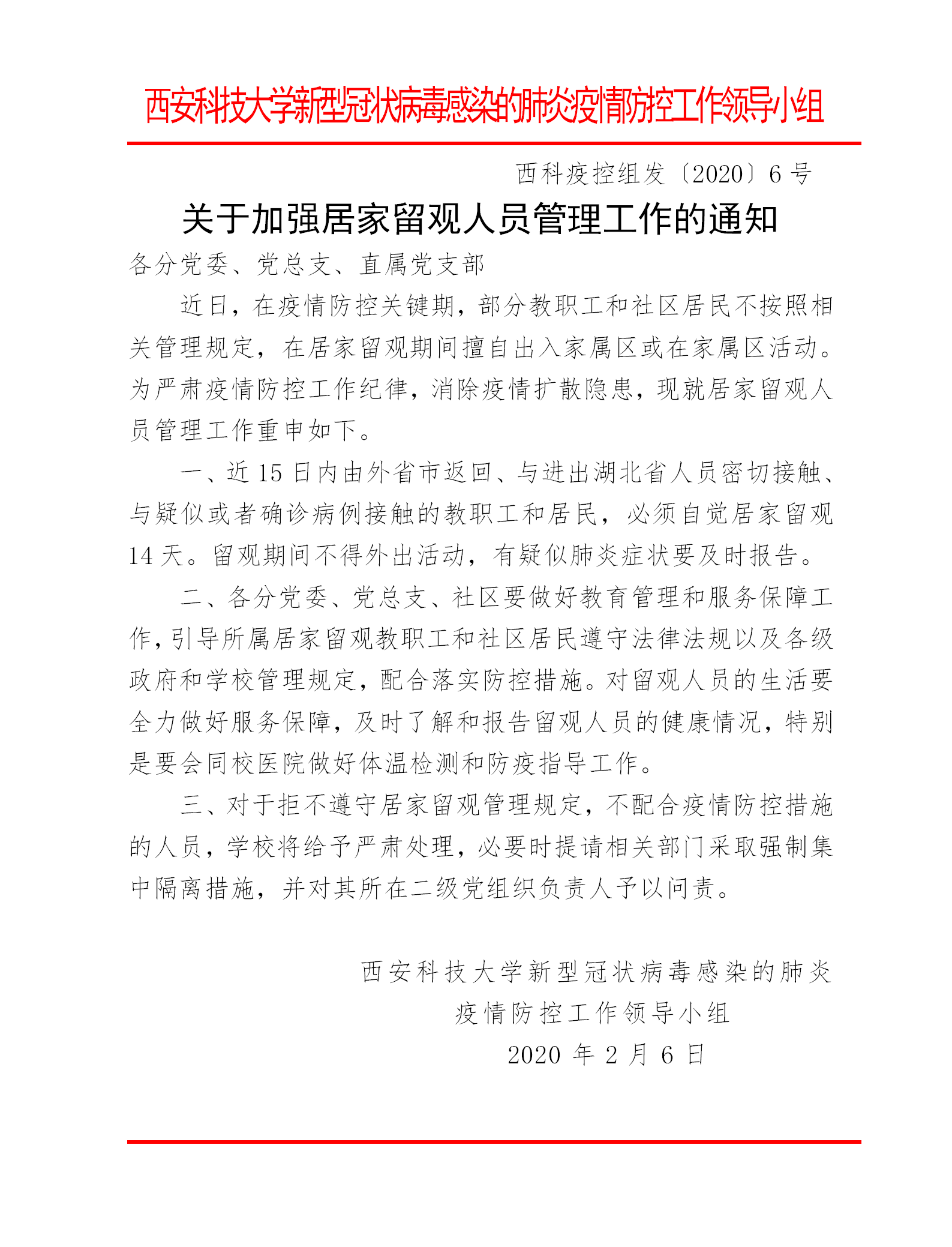 关于加强居家留观人员管理工作的通知(西科疫控组6号)